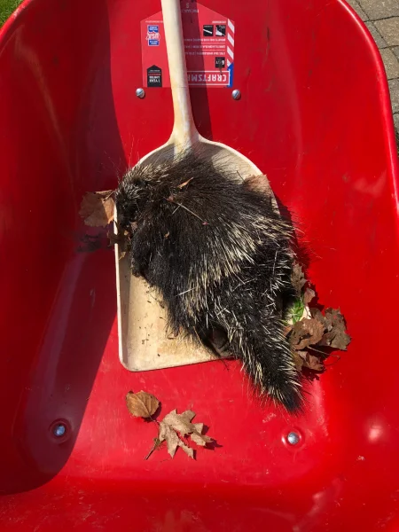 2 hrs later, I figured we must have gotten a rave review on the Porcupine Yelp. Our leisurely late lunch was interrupted by me seeing another porcupine. Stop eating, grab the .410, drop the sucker, put on the permethrin-treated clothes, put the carcass in the wheelbarrow, take it down to the dock.