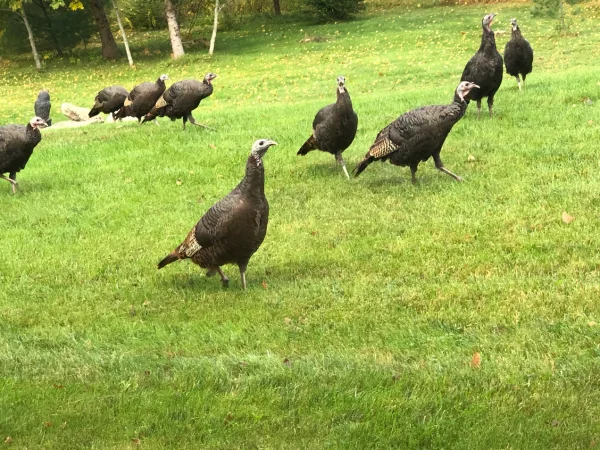The Local Hen Party paraded through the yard this AM. Wow how they've grown. In this Turkey Day Care of 18 there are 3 adult hens and the rest are this spring's hatchlings!!