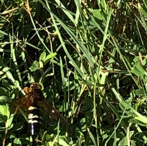 Black abdomen with mostly whitish tinge of yellowish stripes. Don’t think it is a yellow jacket queen?? Been buzzing around my grass for two days.