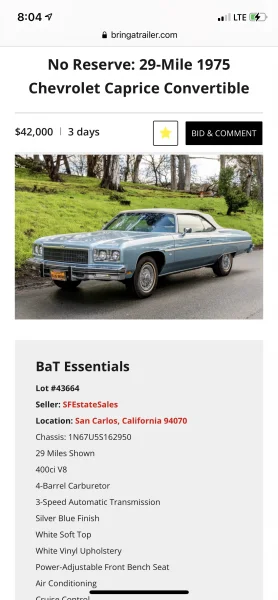My first car when I was 16 was a 1973 Chevy Caprice with the small block 400 in a turbo 400 transmission I just found this online an hour ago it was up to $33,000 it’s now up to 40,000 it only has 29 miles it still has the rappers on the front seats I’m drooling I’d love to have this car I love big cars