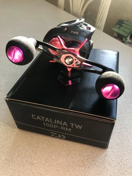 To to put a capper on this (for now), and to the extent that I can, sitting here with my boat up on blocks, I went ahead and made a few "upgrades" to what is already a solid reel. The first order of business was to address the factory-supplied long, narrow handle knobs. I think they could be fine. More than fine, actually. For others. I do prefer a slightly fatter knob, and so with that in mind, I ordered in a pair of EKFan knobs, via AliExpress, with pink accent caps of course.