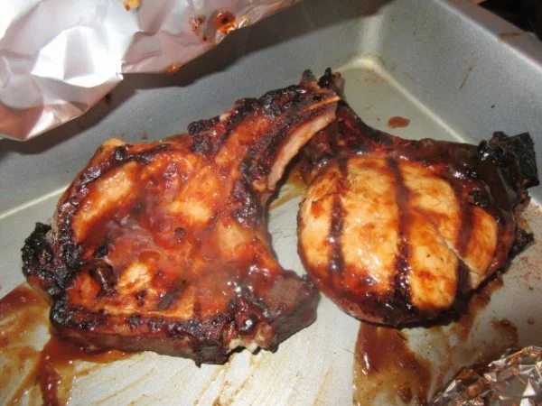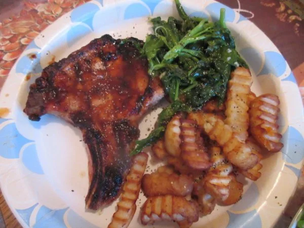 grilled pork chops tonite with blanched spinach from our garden and oak leaf maureen picked,, some fries,,,,,,,,,,,,,,,,,, ><))):>