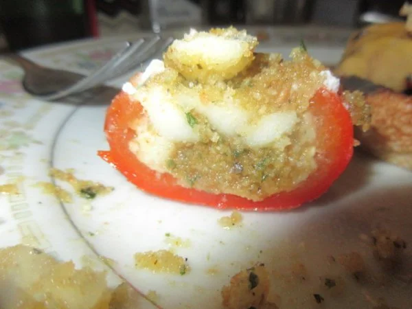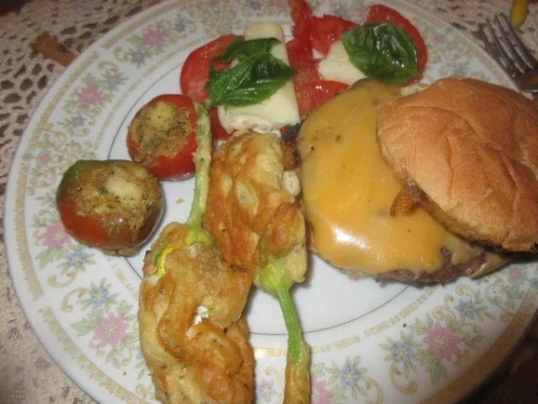 Fried zucchini flowers? Yummmcheese burgers ,, yellow flowers,, i stuffed a couple hot cherry peppers,,and the tomato that maureen picked today,, made it with mozz,, basil,, oil,,,,,,,,,,, ><)))):>