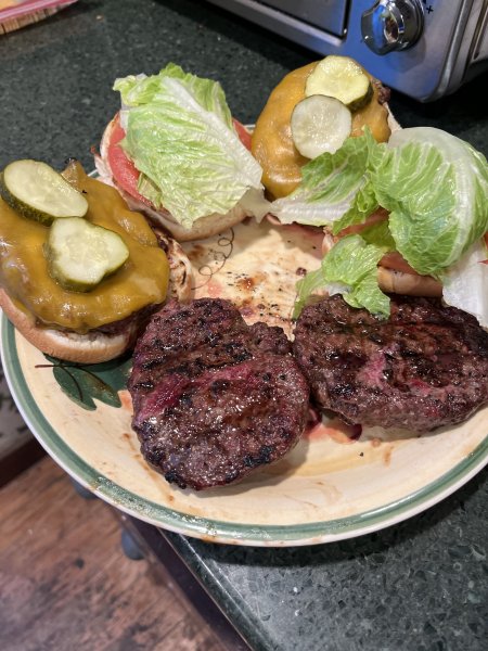 Fresh local/bought burgers, Local bought over sized Thomas English muffins (fresh made from the english muffin guy Store bought Swisss cheese/onions (couldnt find those local) Muffins were hand put (by me) in the bacon grease /then transferred to the BBQ GRILL (ALSO BY ME) From there I added Swiss cheese/onions /bacon to the burgers and added my secret sauce of MAYO Ketchup S&P and a splash of old bay