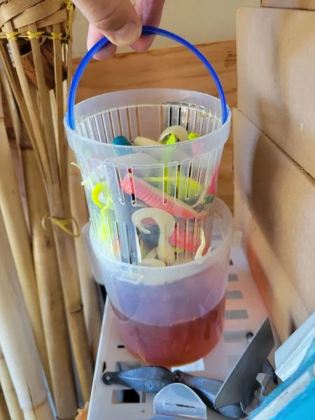 Not a major issue for most "normal" users of GULP!, but not me, of course! Because the fishies on "my grounds" can often show a marked preference for a specific color woim, and also because of the normal Summertime infestation of bait-tearing pin biscuits and small ling, I need to carry multiples of each color, so to stay in the game on a hot bite. I was greatly embarrassed on a recent trip - having to borrow a Pink Shine or two from Capt. Mike - which debt I need to repay this weekend. I just flat ran out of the ONE color they were really keying on. Its just the way it is sometimes. Such is the life . . .