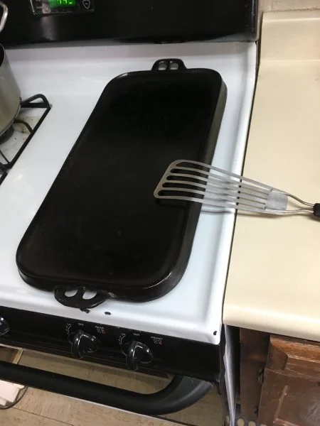 hey Doc, heres a pic of my Lodge cast iron 2 burner griddle. I "only" use for Pancakes (buttermilk) or french toast maybe eggs... had it 30 years, makes 2 very good size cakes at a time light and fluffy... there are electric griddles out there too with a good even heat control... and ya gotta get maple syrup, Aunt Jemima not allowed...cellfish...:oops::D:p