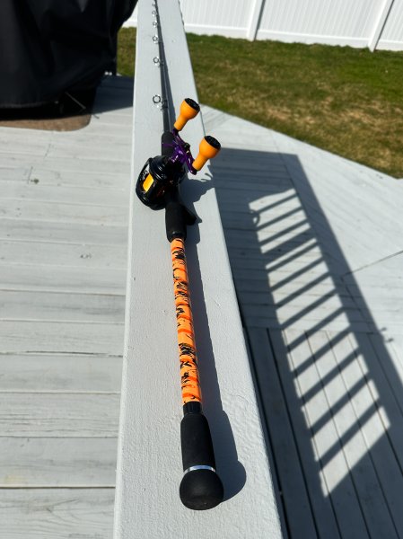 As delivered I do believe that it was a might too wide to slide into my boat's Lee rod holders. So I had to do a bit of modding, sanding down the mushroom-shaped butt a bit, turning it into a sweet round ball-type "butt cap." I also trimmed the grip's length and sanded it to a rounded fore-edge. The provided aluminum trim ring was a nice touch as well. Used my Mudhole grip hone to open up the inner hole's ID to match the 0.77" blank butt. Glued it all up, let it sit a couple of days and then wrapped the exposed blank with Winn Grip tape.