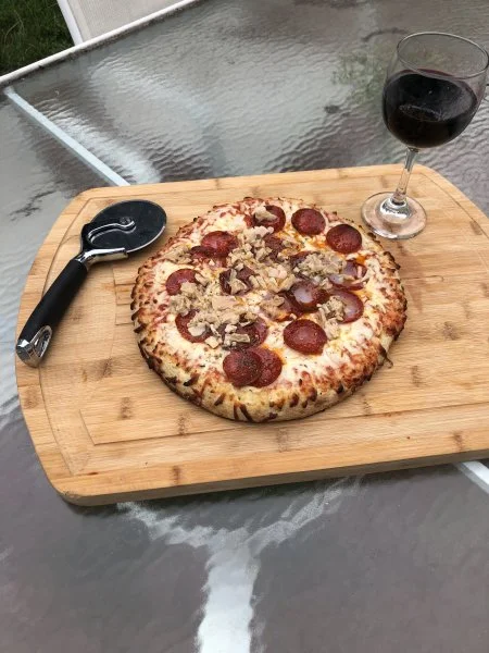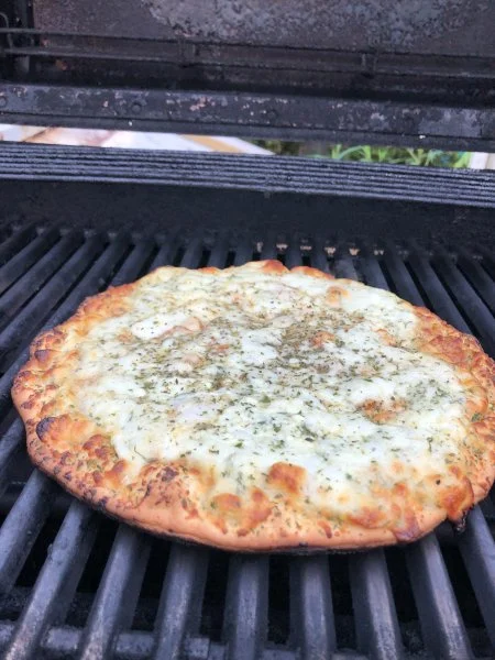 Hey Jaws. Yes white pizza a couple of cheeses. I have a stone; used it first to heat up the dough a little then took it off, made the toppings Put them right on top and adjusted temperature. About 12 minutes at 400 or so