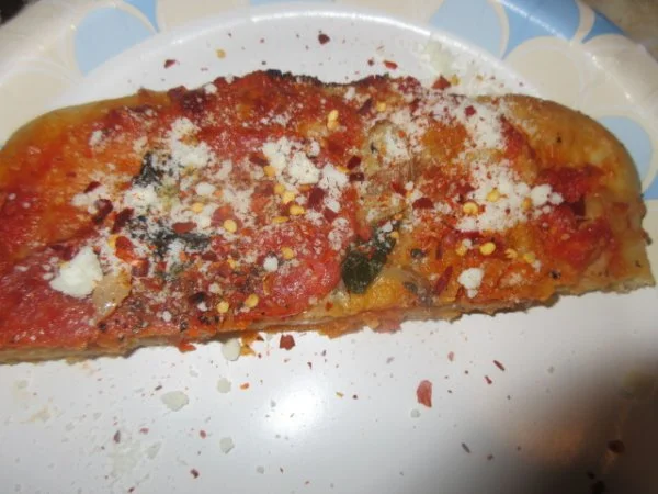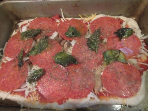 another mojoe pizza tonite,,,whatknot more pepperoni,, onion,, mushrooms,,,fresh basil,,cellfish oregano too,greated cheese,,,crushed red pepper for mojoe,,,i like the ends,, maureen gets the middles :p ><))):>