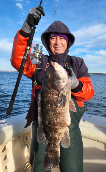 With a very cold but flat calm start this morning I headed straight to my favorite jig drop by Fishers Island with long time customers Sal and Frank. Dropped the anchor once and never budged again until we pulled out at noon as the forecast breeze started to freshen. Within a minute of dropping the baits Sal’s drag starts to sing and he quickly boats a nice 17” keeper. We box that fish, Sal re-baits, a few moments later he gets a very light hit, sets the hook, and the next fish really turns on the jets! After a very spirited battle with several good runs, I slip the net under the second largest Tog of our season at a solid 81/2 #.