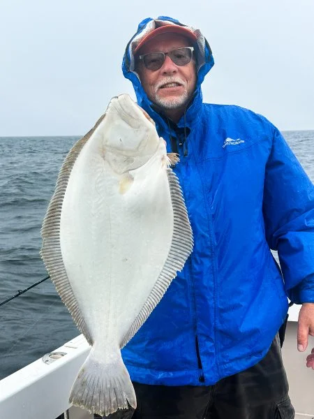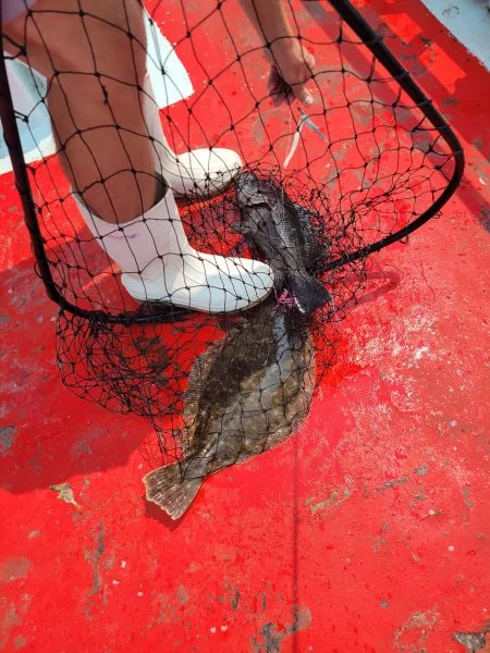 The next change was 1:00 - and with it the weather totally turned. Big wind, like 20kts big, with light rain and big-ish waves and we were off to the races. Off came the 3oz buck tails, on went the 8oz sinkers. Turned out great - limited in all the wind to Ken's 7lb2oz fish, the current leader in the boat's 2023 heaviest fluke contest. Also included in the catch a - 5lb8oz fish and a pair of 4lbers. Pretty solid quality, I would say.