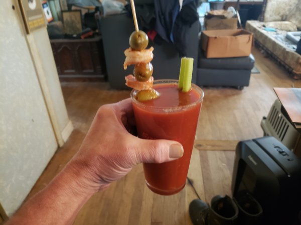 We have a Winner.Kind of a snack Titos/Old bay bloody Mary shrimp/stuffed olives celery added horse radish/pepper