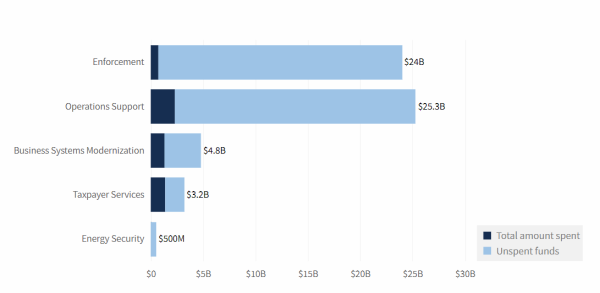 As of March 31, 2024, the IRS has spent $5.7 billion of its $57.8 billion in IRA funds. Note: The IRS initially received $79.4 billion from the IRA. The Fiscal Responsibility Act of 2023 rescinded $1.4 billion, and the Further Consolidated Appropriations Act of 2024 rescinded an additional $20.2 billion