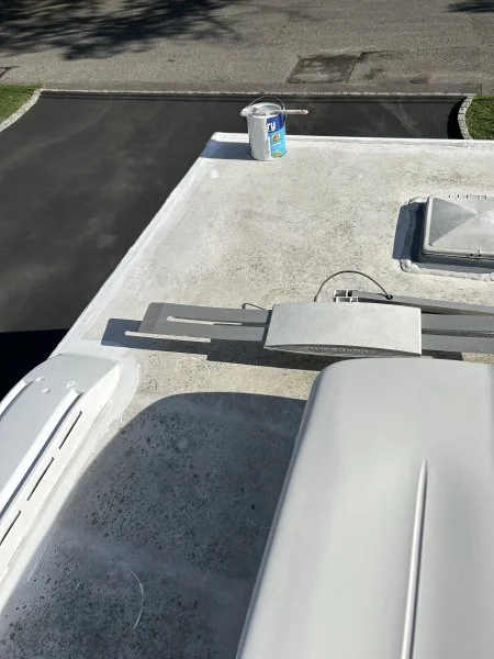 Roasting on the camper roof as I seal up all seams with lots of gunfire in the background from the shooting range down the road a piece.