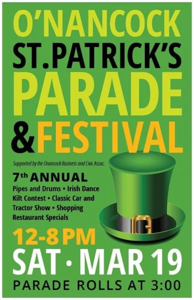 The 7th Annual O'Nancock St. Patrick's Parade begins at 3 pm on Market Street with the theme, “Shamrock by Shamrock, Spring Begins.” Street closures will occur and will be announced on the Town of Onancock website.