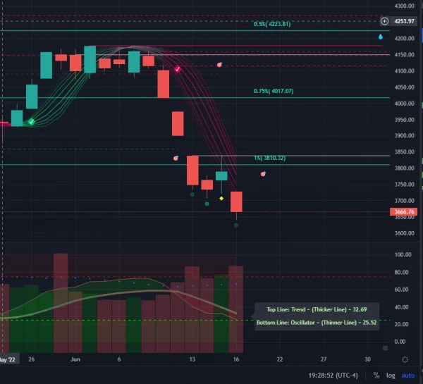 Was really hoping for a move to 4050 to start entering new shorts....didn't happen....These are the near-term levels on the S&P daily that would have to clear for any type of pivot higher. First have to clear 3810, then 4017, then 4223. Each move into those areas will be shorted/sold on swing failures. You can see the green candle from yesterday, wicked into and could not clear 3810.