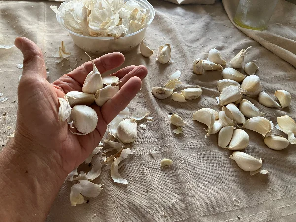 peeling beautiful large cloves of garlic 🧄 into a jar , filled with olive oil… cell…