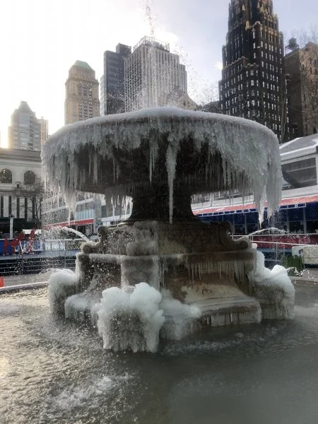 this is fountain at Bryant Park this morning. This is how cold it is it’s semi frozen outside, the wind burns like crazy.