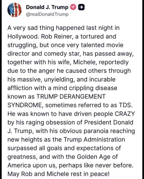 Trump sustains political attack on Rob Reiner in inflammatory post after his killing