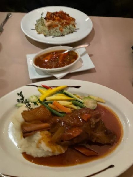 Main course swordfish served wit basil mashed potatoes and three tomato caponata. Slow braised Lamb shank with garlic mashed.