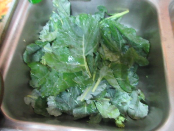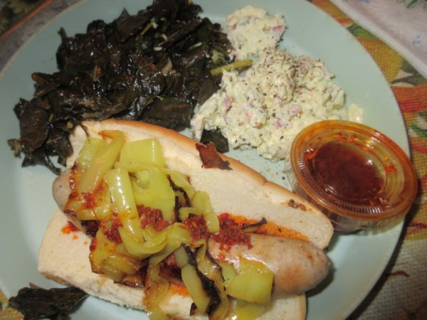 bratwurst,,hot oil,, patato salad ,,maureens green peppers sliced up and our cooked down broccoli leaves,,,,,,,,,,,,,,,, ><)))):>