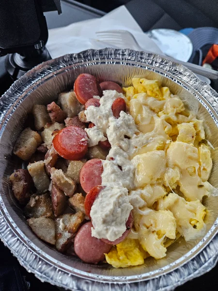 Excellent food thereWendys Deli in Mattituck. 3 eggs Swiss kielbasi home fries and creamy horseradish