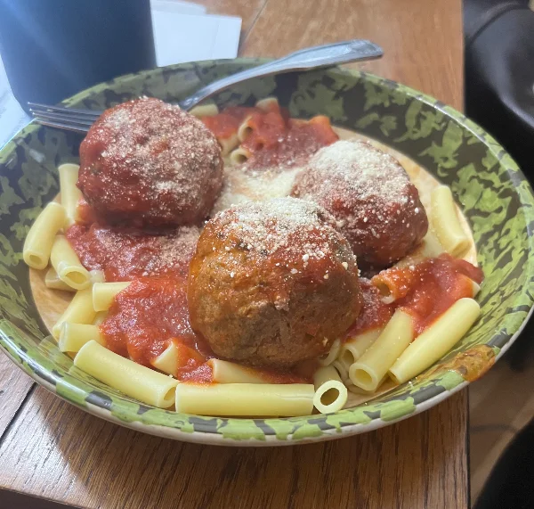 Broccolini and cheesy Orzo with crusty bread for dipping into the francese sauce