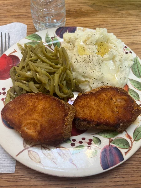 Breaded pork chops, string beans, mashed potatoes View attachment 103435