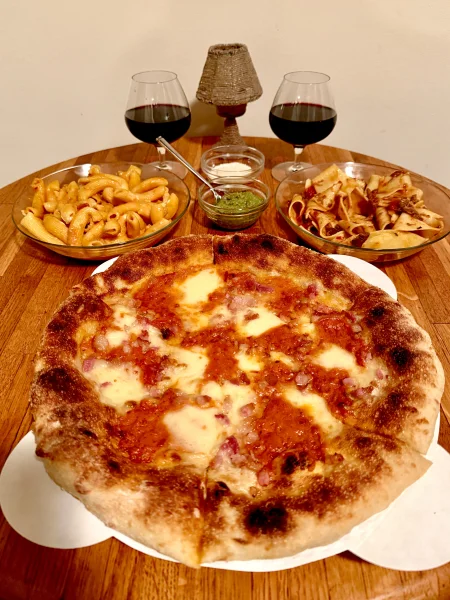 Rigatoni Bolognese, Pappardelle; both homemade pasta and ‘spicy vodka pizza’ and some green stuff, it begins with aT
