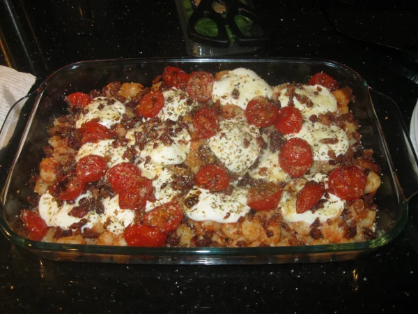 Baked Mini Gnocchi with Marinara, Fresh Mozzarella, Fresh Basil from the Farm Stand, Pancetta & Fresh Cherry Tomatoes also from the Farm Stand