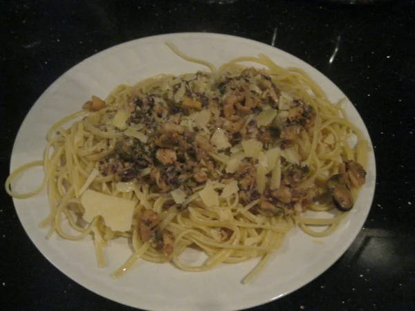 Looks like Clem sauceSquid & Mussels in a Olive Oil, Red Pepper Flake, LEmon, Garlic, Anchovy Paste, Oregano, Thyme, lots of Tarragon & a little bit of Dry White Wine Sauce over Linguini topped with a touch of Shaved Romano
