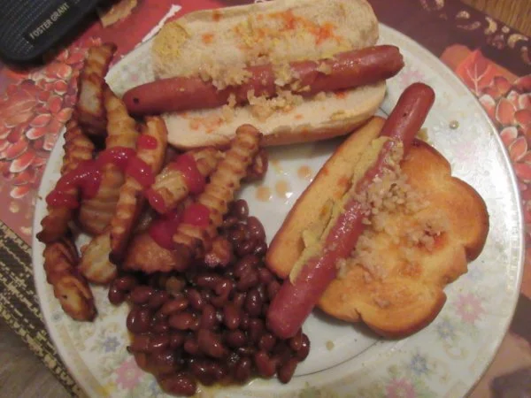AWESOME MOJOEhotsauce garlic dogs,, one hot dog roll,, one on wellfair bread,,,,,,,,,,, nathans ff,, beans,,,,,,,,,,,,,,,,,,, ><))):>