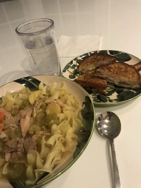 Sliced shell steak n Vermont cheddar grilled cheese sandwich and a bowl of homemade chicken noodle View attachment 14990soup!!?