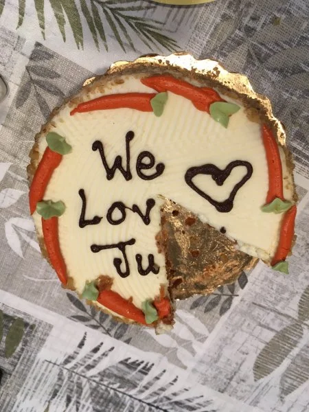 “We are eating delicious carrot cake from Whole Foods that was in the back of the freezer from last summer”