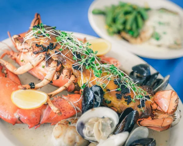 Obscenely Stuffed Lobster with a Semi Sweet Lemon Egg Custard Crust. Whole 1.5-2 pound Lobster Stuffed with Crab Meat, Jumbo Shrimp and Its own Tail Meat then baked with a Sweet Soy Vinaigrette and the Lemon Egg Custard which seals in all of the flavor allowing the Crab and Lobster to take center stage. The Tobiko Eggs sprinkled on top give it a subtle salty mouth pop. Surrounding the lobster is U-10 Dry Pack Scallops, Local Clams and Mussels in a Brandy Cream Sauce. Sides included are a Savory 3 Cheese Virginia Ham and Potato Lasagna and Chilled Limoncello Sugar Snapped Peas. Pamper yourself! It’s the weekend!