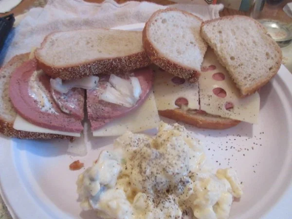 Sacrilege that sandwich only deserves spicy golden brown mustardtonite,,,,,,,,,,liverwurst with onion and swiss,,mayo on very slight toasted rye,, potato//egg salad and mojoe garden salad,,,,,,,,,,, ><))):>