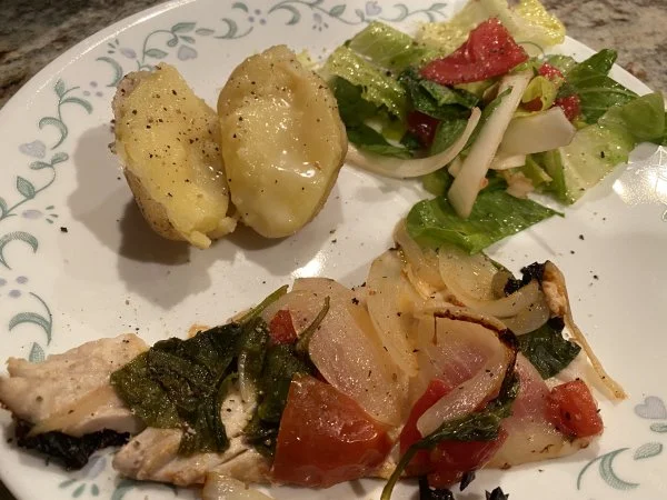 Nice!!Sea bass on the grill with fresh onion, tomatoes and spinach, boiled taters, salad and also Turkey roll ups for the non fish eaters View attachment 25314View attachment 25315View attachment 25316View attachment 25317
