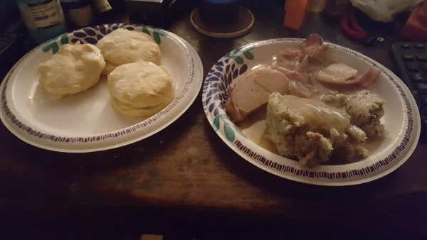 Looks great ?Turkey tenderloin wrapped in bacon,stuffing and biscuits loaded with butter