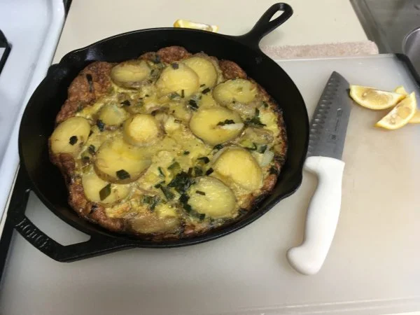 Guess doing it in the oven beats having to flip it on a large plate when making a potato and egg omelettePre heat oven to 400’ or so... sautee in olive oil, half of green and red pepper for a minute, then one large onion till soft, let pan cool... scramble 6 eggs in a mixing bowl wit some grated cheese... transfer veggie to mixing bowl.. reheat pan to high, add more oil in pan for flavor and classic frittata...