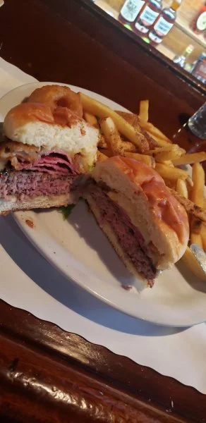 Black Forest Burger ( medium rare) with Pastrami and munster cheese