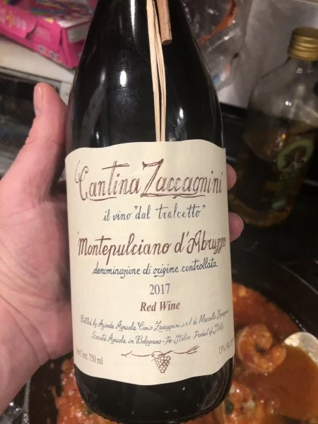 FantasticShrimp Fra’Diavlo, warm bread and a bottle of Italian Red wine.