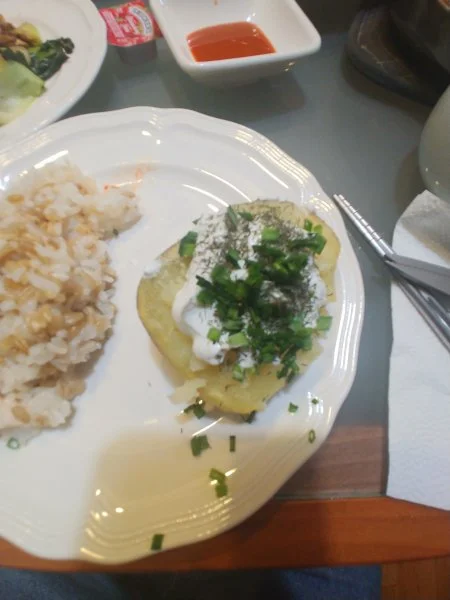 Chicken breast, tofu pan fried, one plain one cooked in soy sauce with onions and jalapeno peppers, stir fried baby bokchoi w mushrooms, kimchee, and radish kimchee gazpacho.