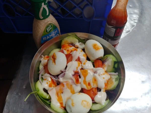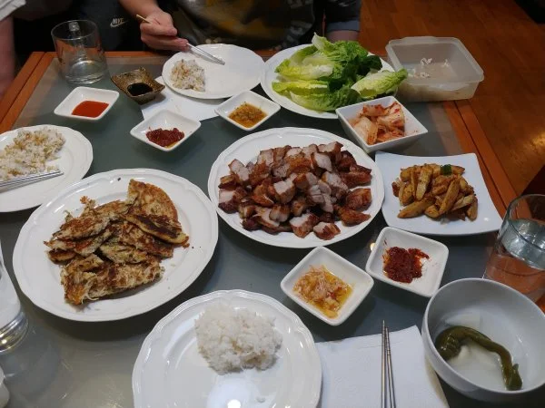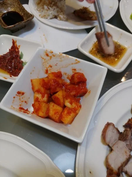 Pork belly air fried dipped in krill and garlic sauce, mung bean pancakes with bean sprouts with pork, fish cake stir fried in soy sauce kimchee, kimchee gazpacho.