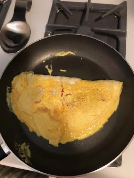4 egg (never seen such small jumbo eggs) Omelet with pepperonI, sharp cheddar and a bit of garlic and onion powder. Tasted really good but I do have to work on that folding thing.