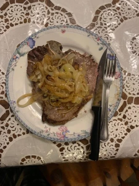 PORTERHOUSE steak smothered in onions......on a porcelain plate...with linen table cloth...and a real knife and fork....inside a "house".......no sides because I'm eating the entire steak!! :)