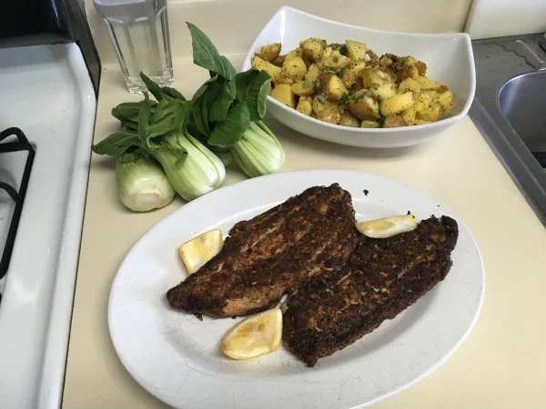gotta tell ya, fresh bluefish is very good, spicy spices makes it right… fennel, cumin, chili & garlic powder all too good… blacken to a crisp…squeeze of yellow… yum…