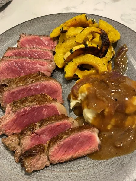Prime NY strip same potato, roasted delicato squash, gravy (stock left from boiled bones) .