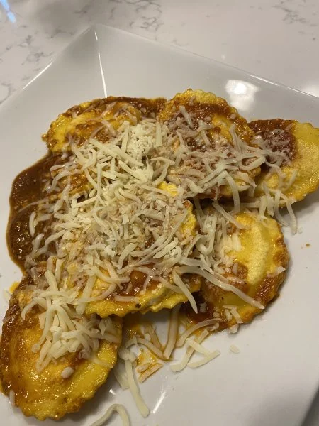 Burrata ravioli. Pan seared, sauce and a little mozzarella on top.