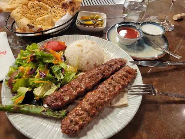 Dinner: Adana Kebab; Ground lamb flavored with red bell peppers slightly seasoned with paprika and grilled. Was served with a salad and Rice. Hot sauce and White sauce on the side.