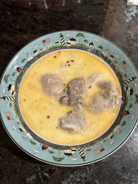 Was lazy tonight, read that as my joints are creaking and my muscles are aching thanks to 2 afternoons out "playing in the mud", but I did marshal enough energy to crack 4 oysters open for a lite dinner of oyster stew...